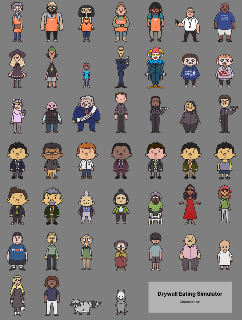 Drywall Eating Simulator is a first-person comedy adventure game by Peripheral Playbox. It was made in Unity and released on Steam in December 2025. I worked on UI design and programming, as well as character art. I also created the game's marketing assets for launch.