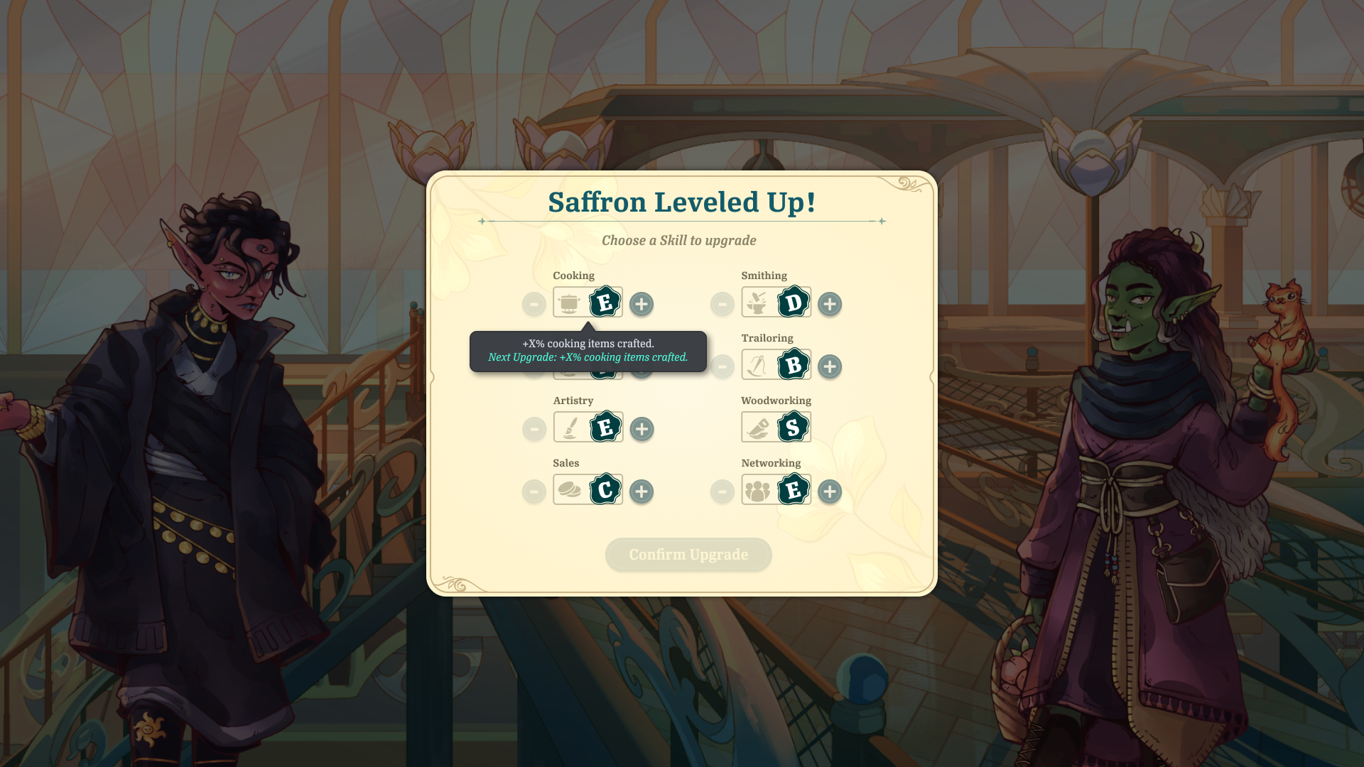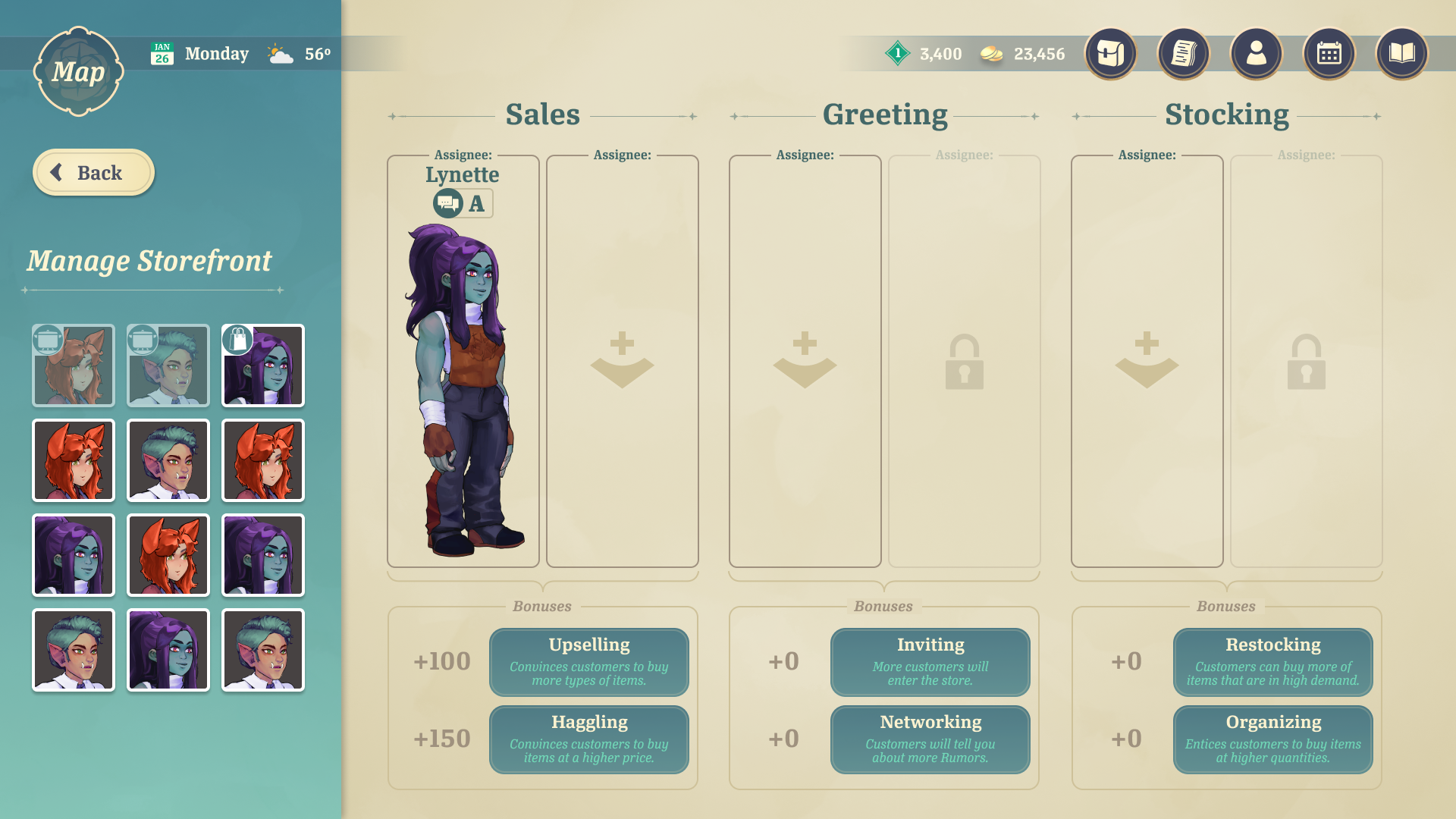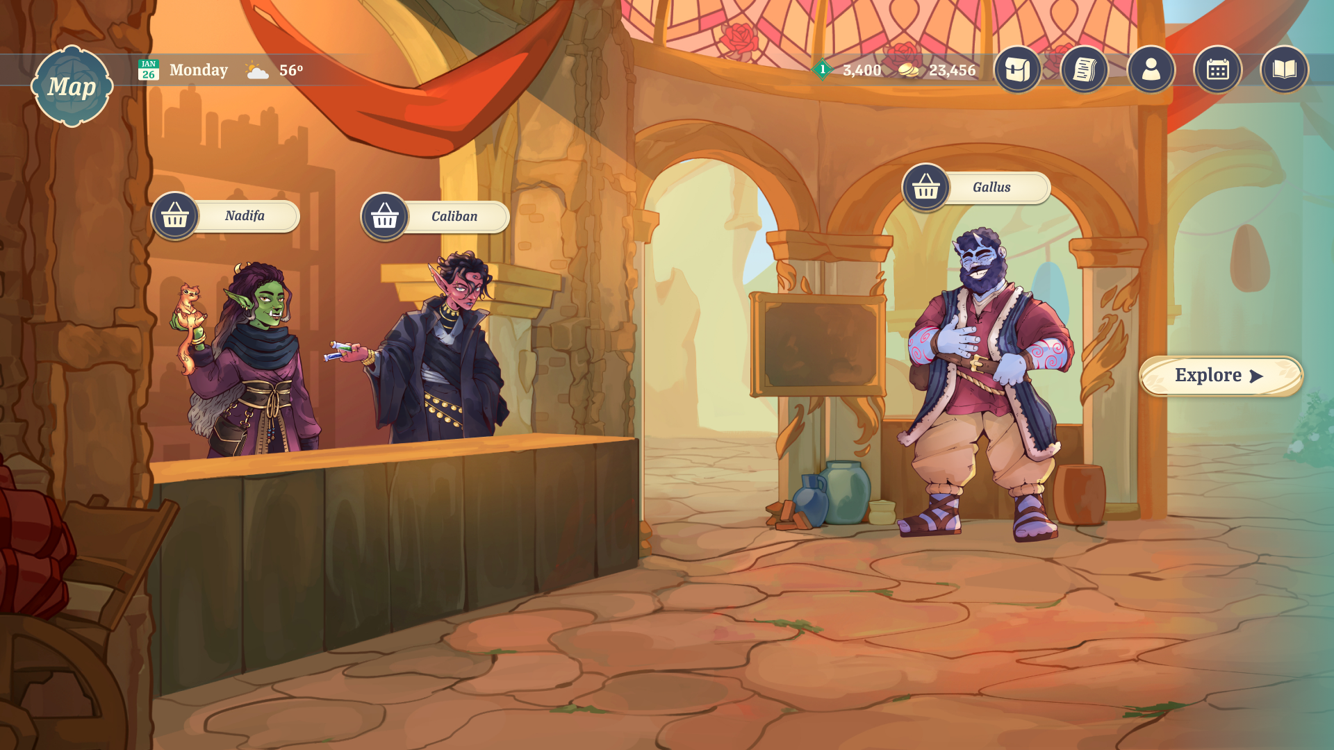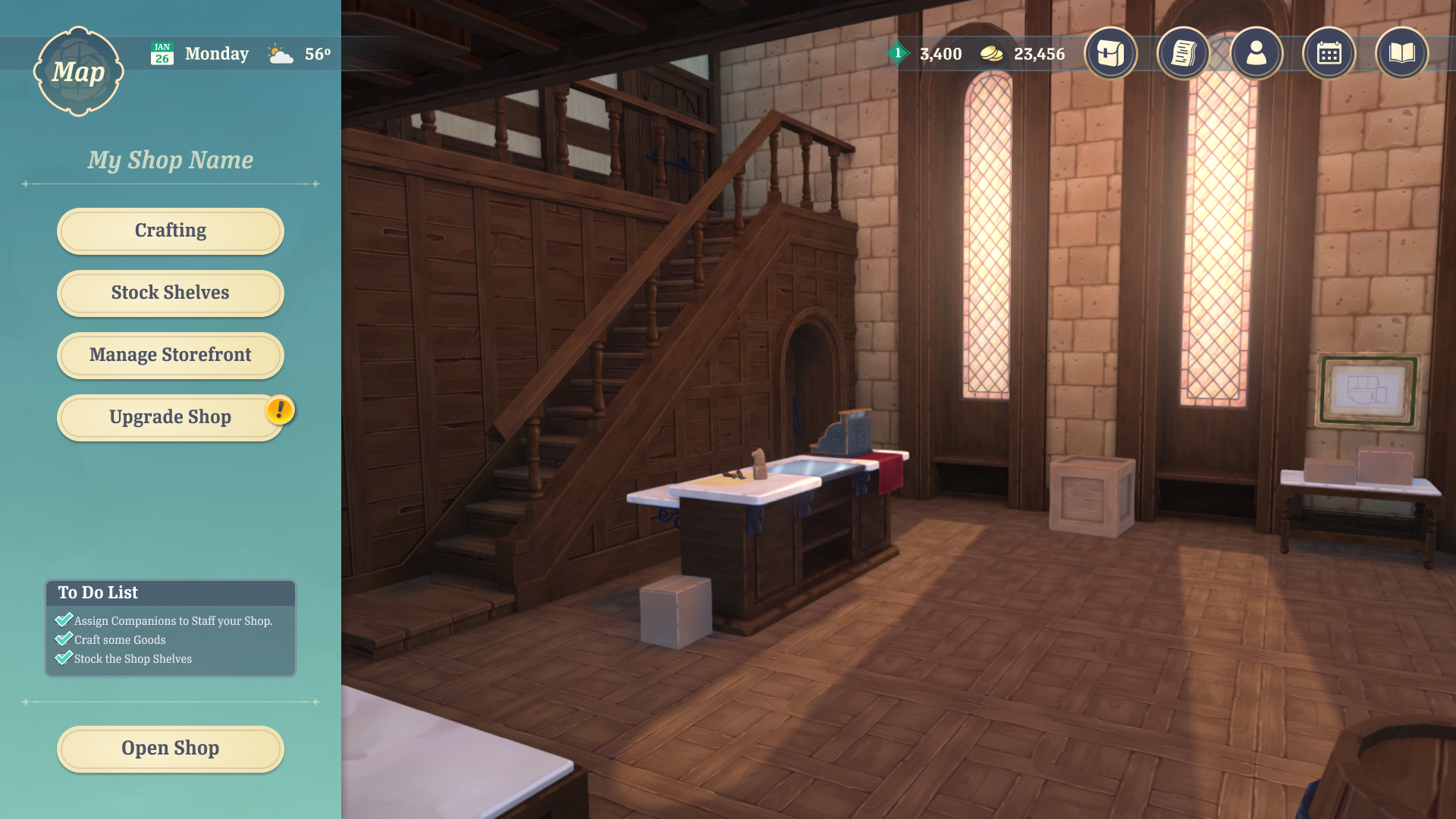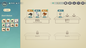The player must manage their own shop to make money. They can assign their Companions to different roles based on their skills, providing bonuses to the shop. They must also stock the store's shelves with items to sell. The player can upgrade parts of their shop to activate more bonuses.