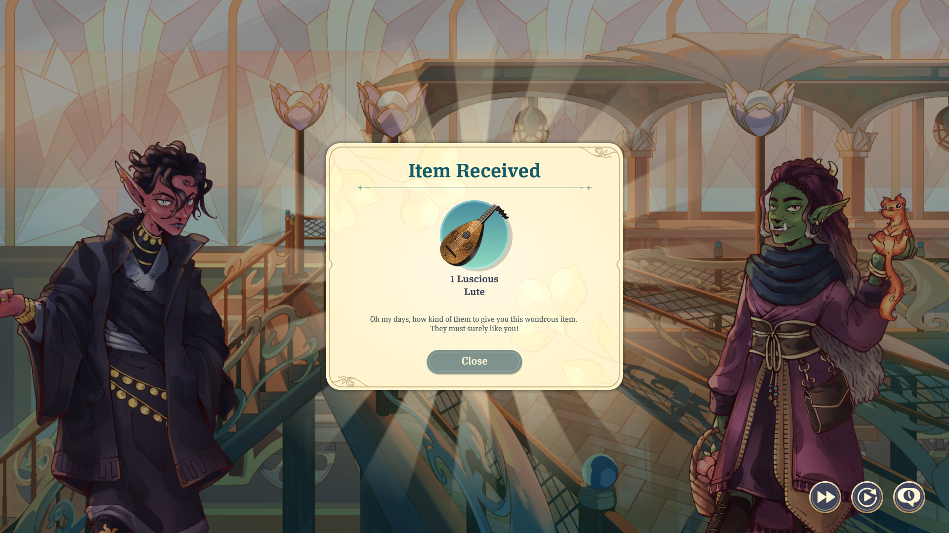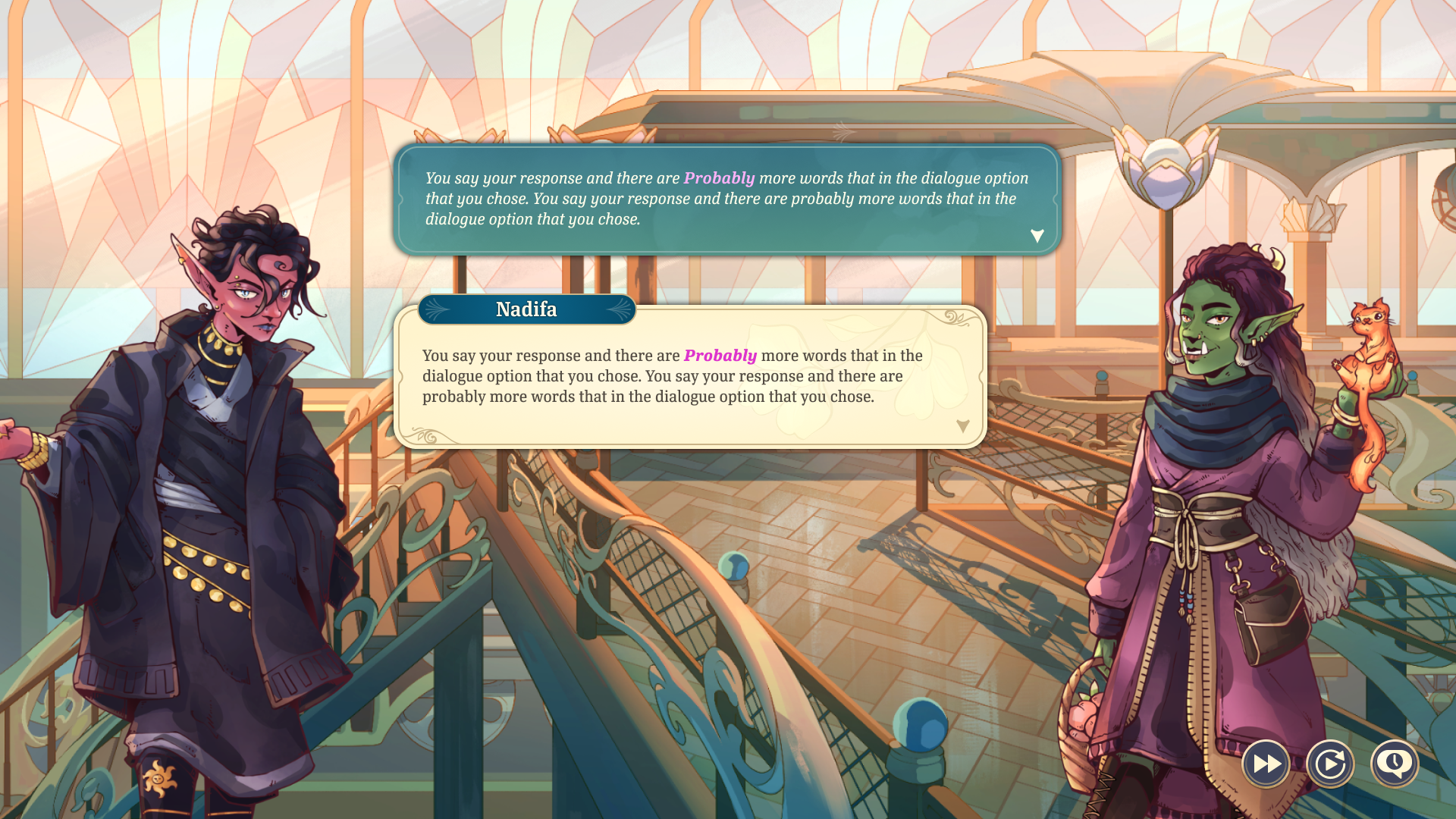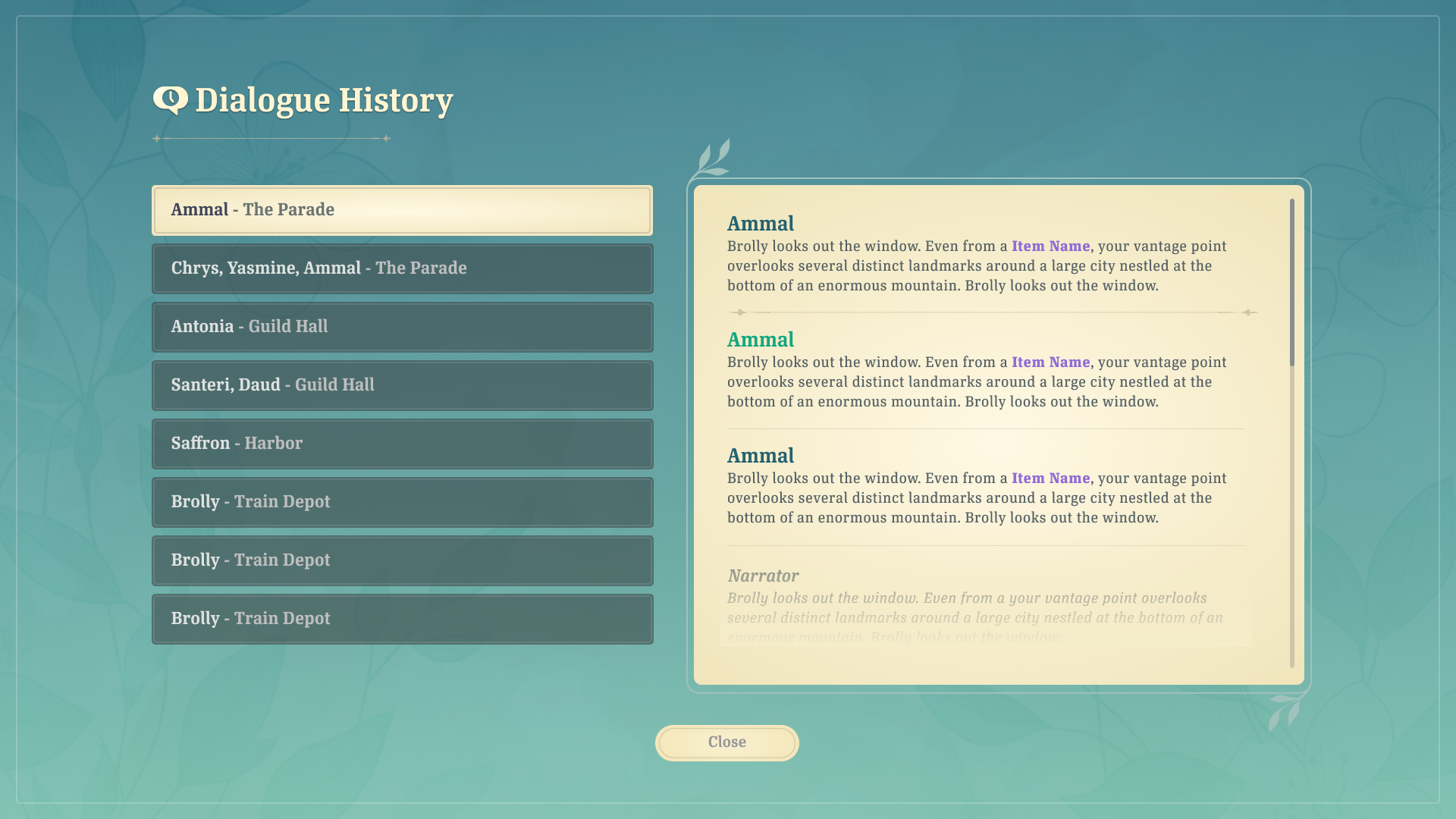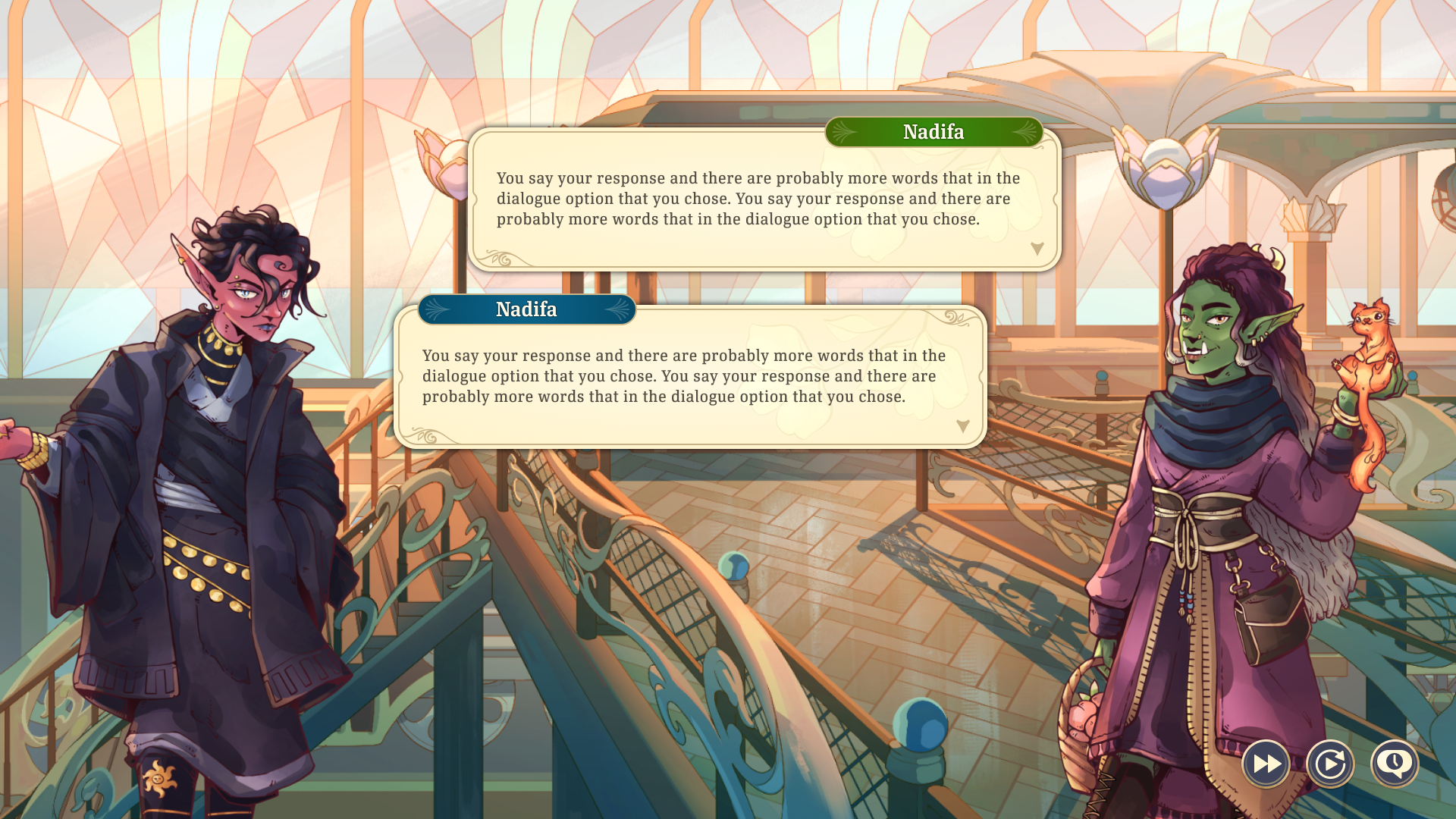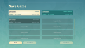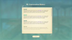 In any scene, the player can open a full dialogue history overlay to review all dialogue sequences they've played through during the session.