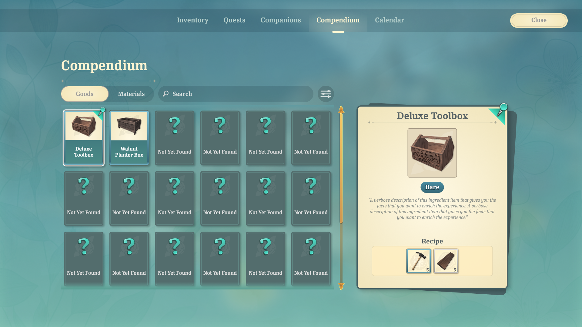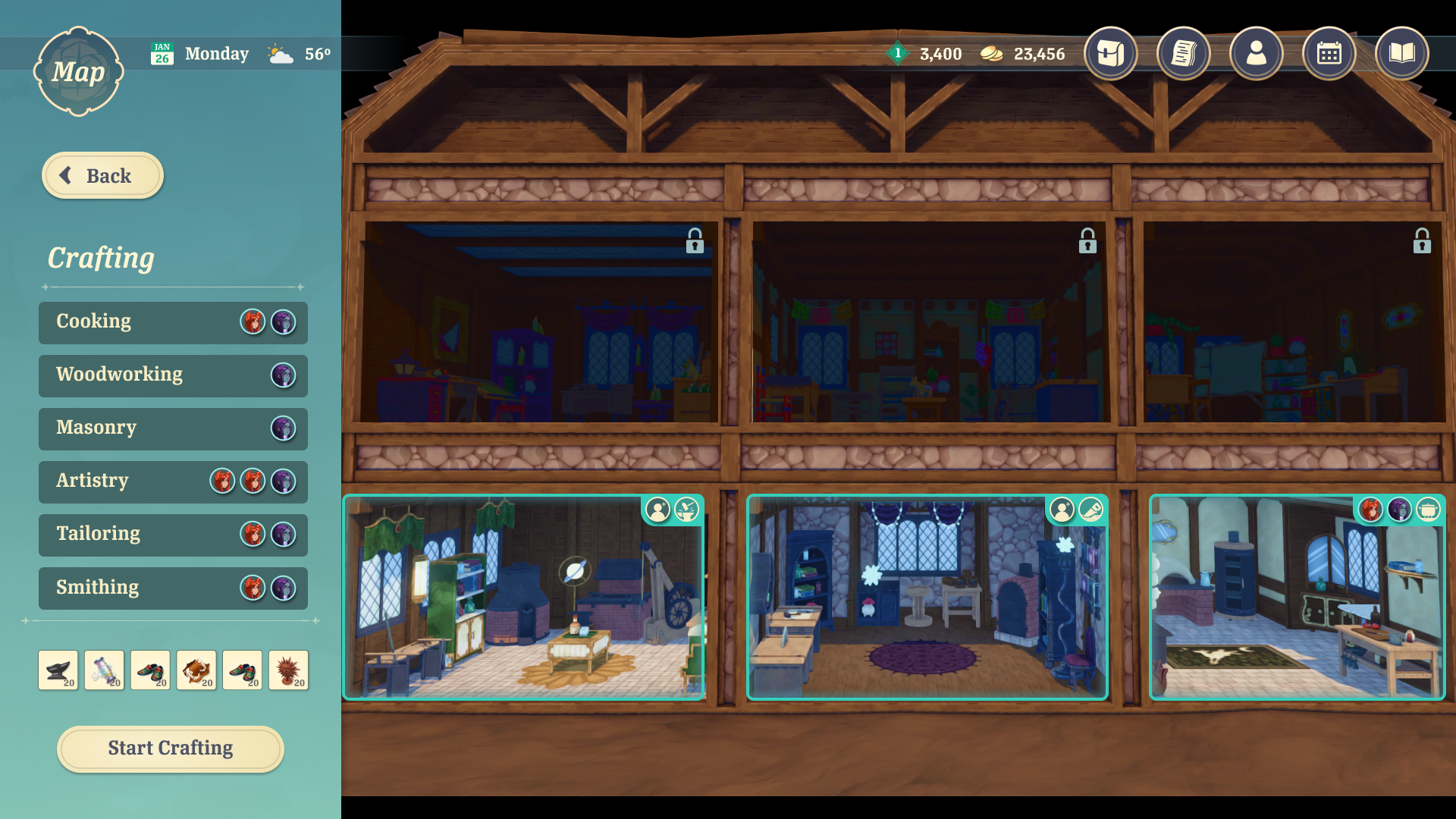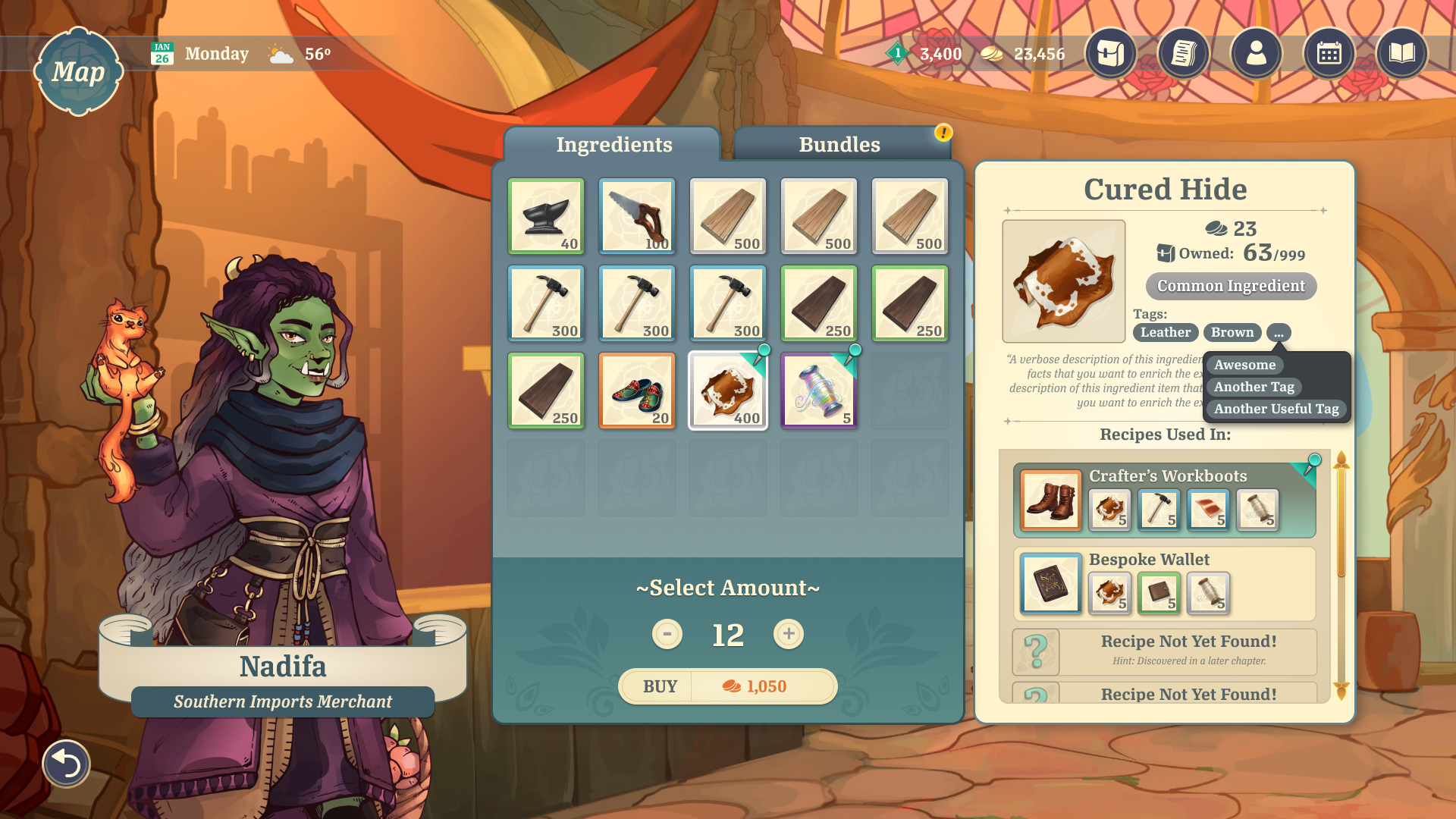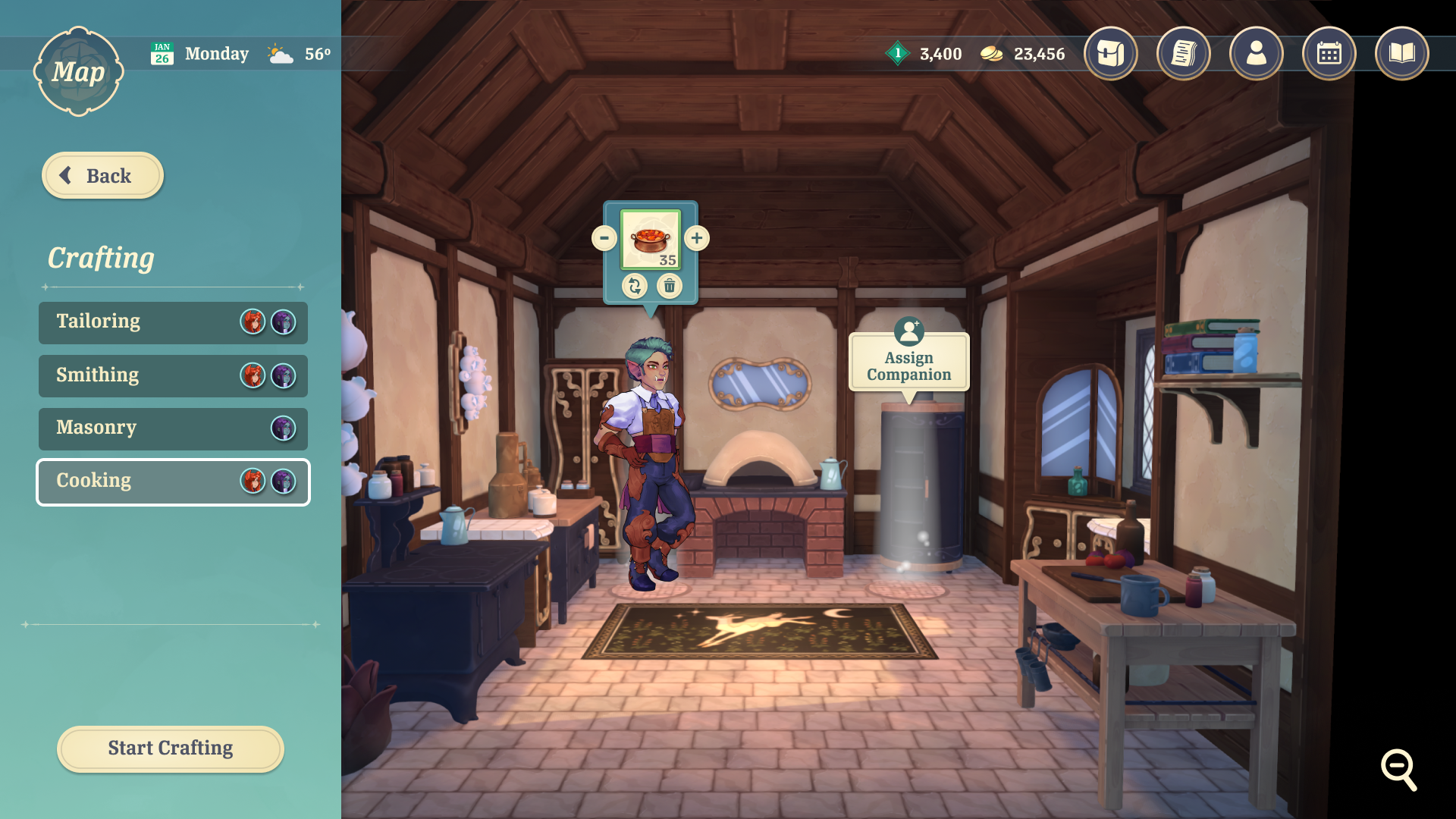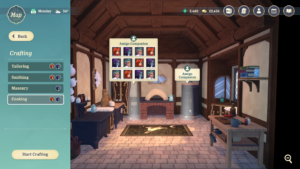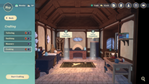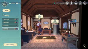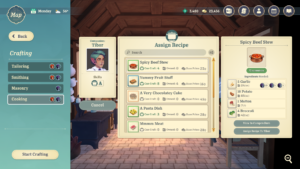 The player's shop must be stocked with items that they crafted in their store's workshops. The player can assign Companions to different workshops, where their crafting skill stats can lead to better crafting outcomes. The player can select recipes and quantities to assign to the workers.