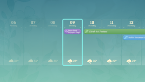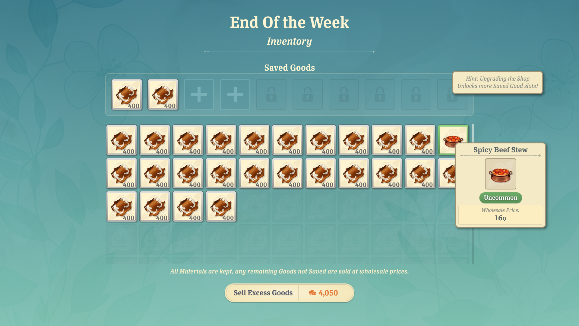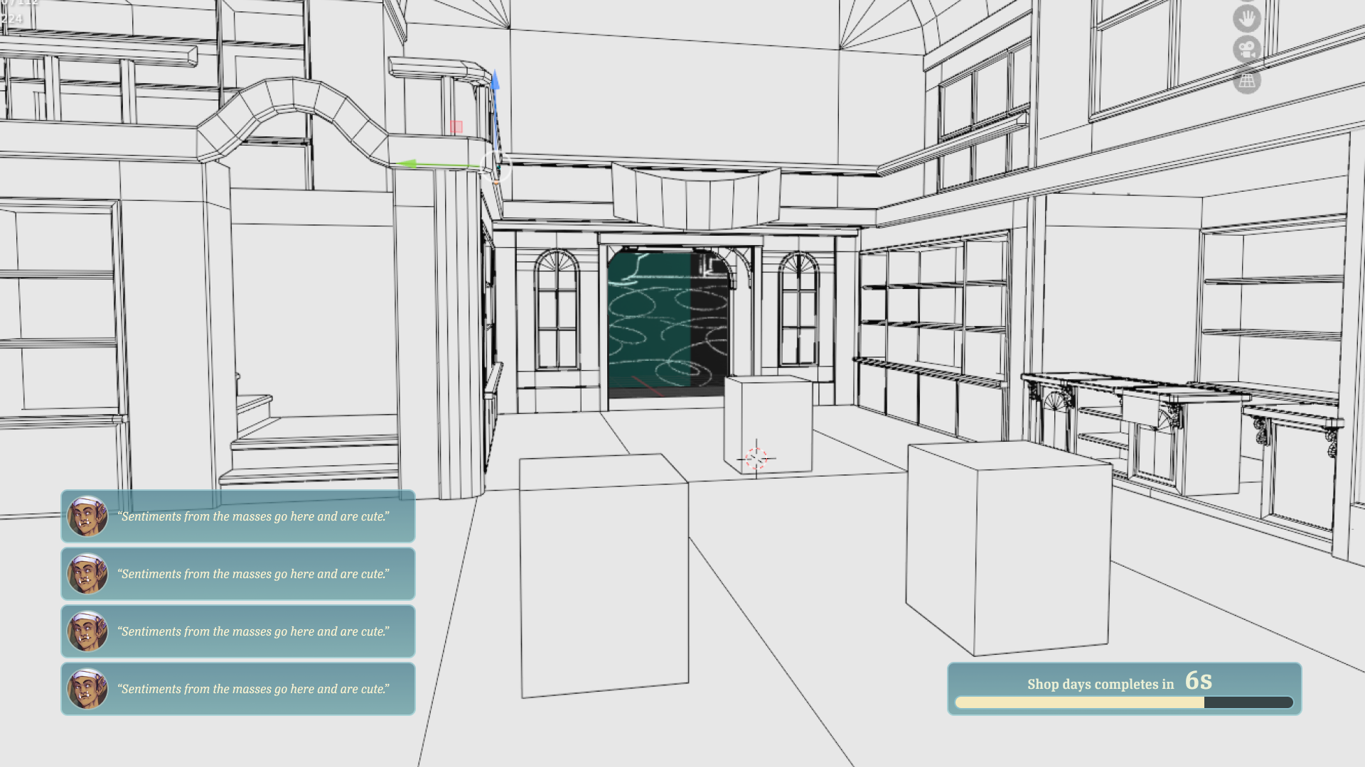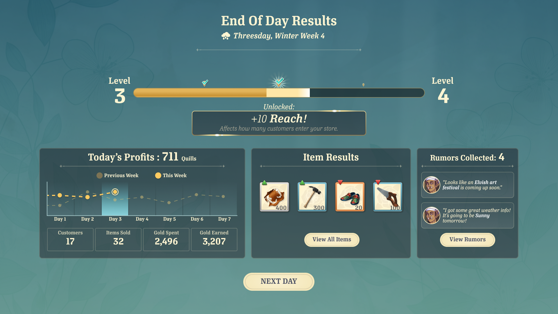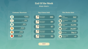 When the player is finished preparing their shop, they can open for the day to let customers in. At the end of the day, the player can review the results of the sales day by looking at popular items and customer sentiments.